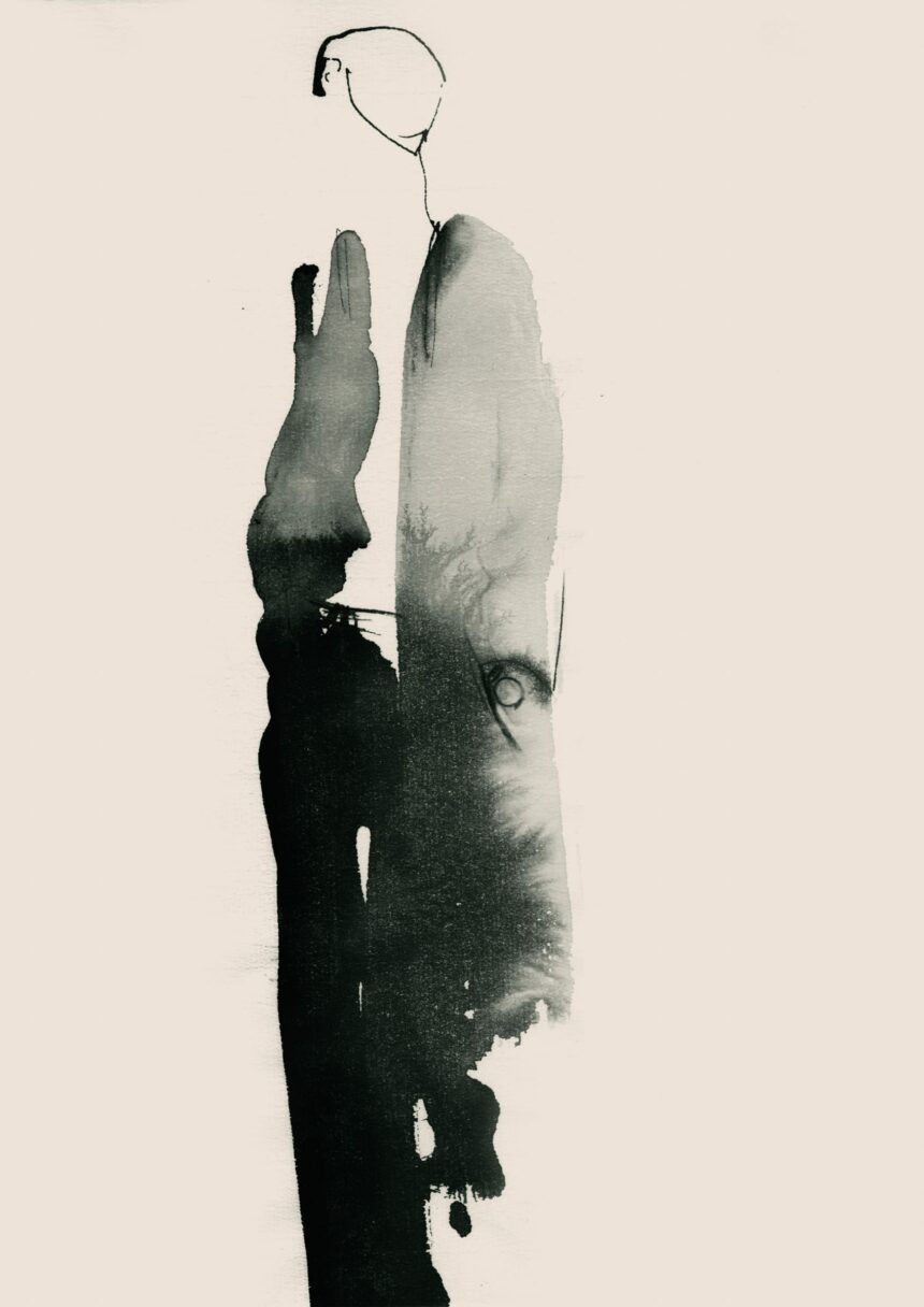 Ink illustration of woman in black dress, walking. By Aurore de La Morinerie for H&M gift cards.
