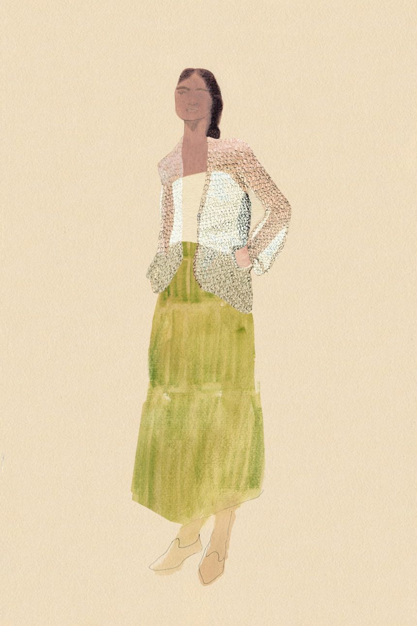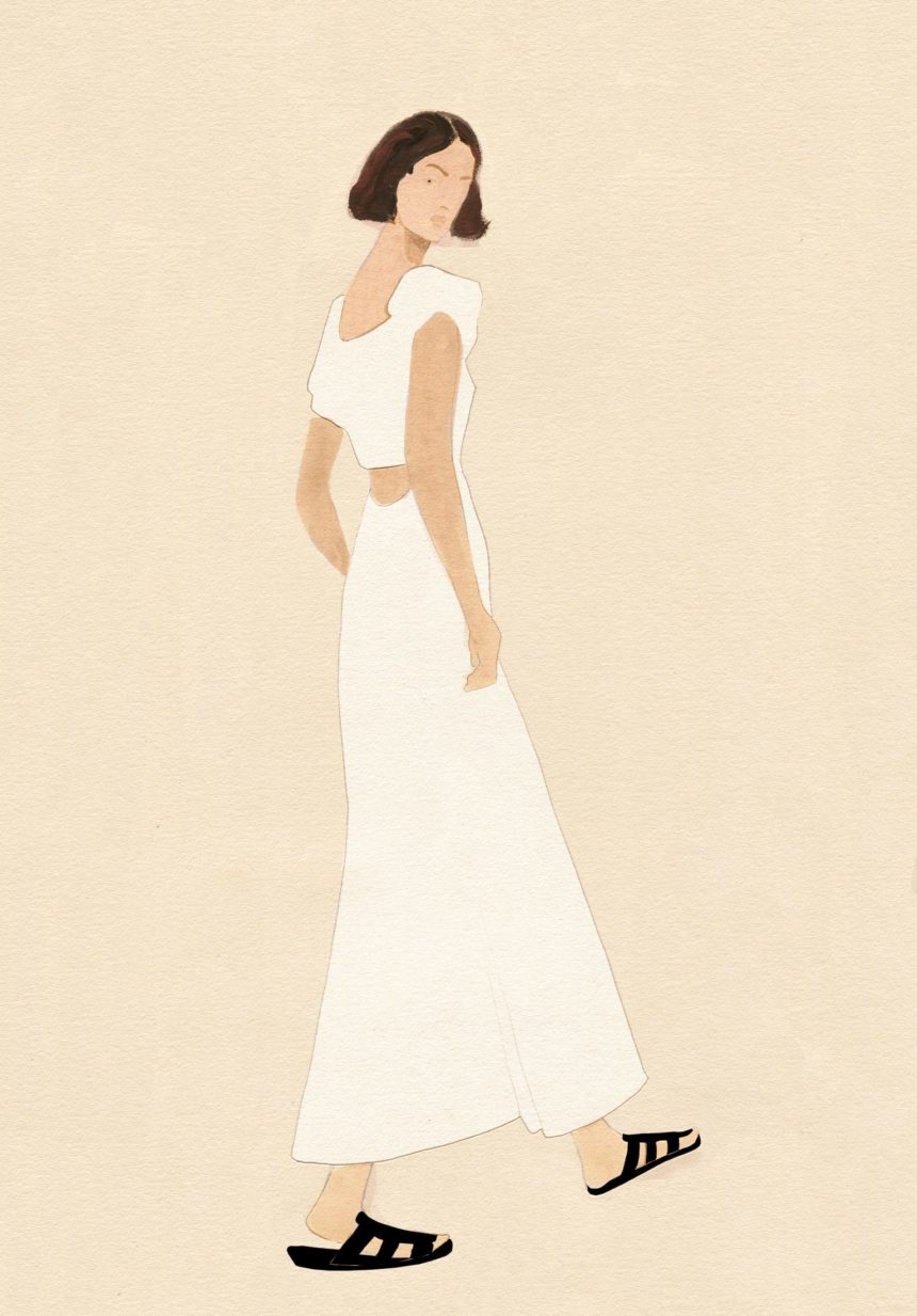 Ink illustration of Valentino couture 2018 dress by fashion illustrator Amelie Hegardt for Les Echos. Ink illustration of woman wearing Louis Vuitton glasses. Ink portrait of top model Kate Moss. Ink illustration of Heather Firbank 1910s outfit, exposed at the V&A Museum London. Illustration of woman with klein blue top and dark eye brows, for Alessia Xoccato.