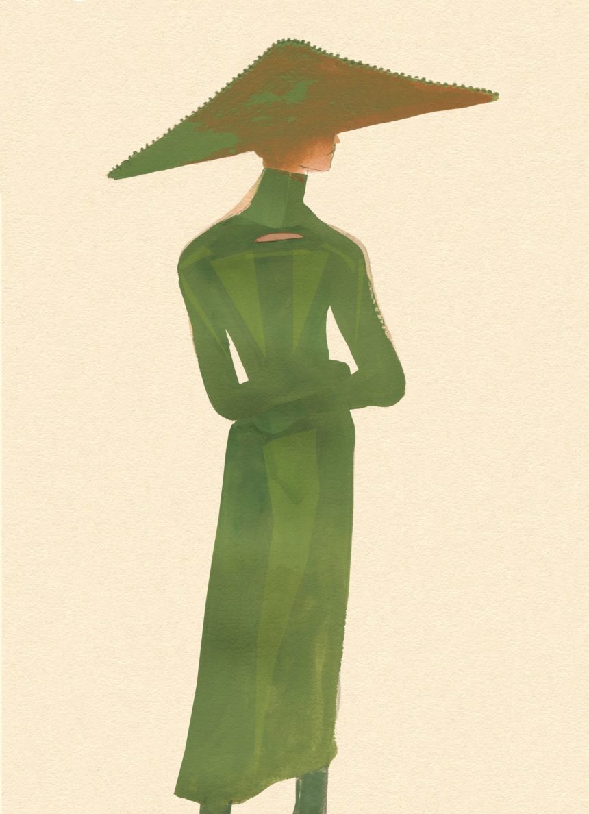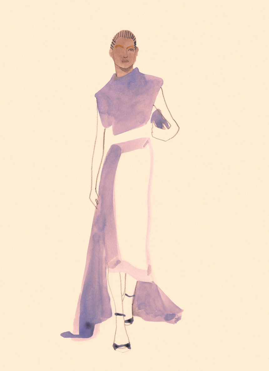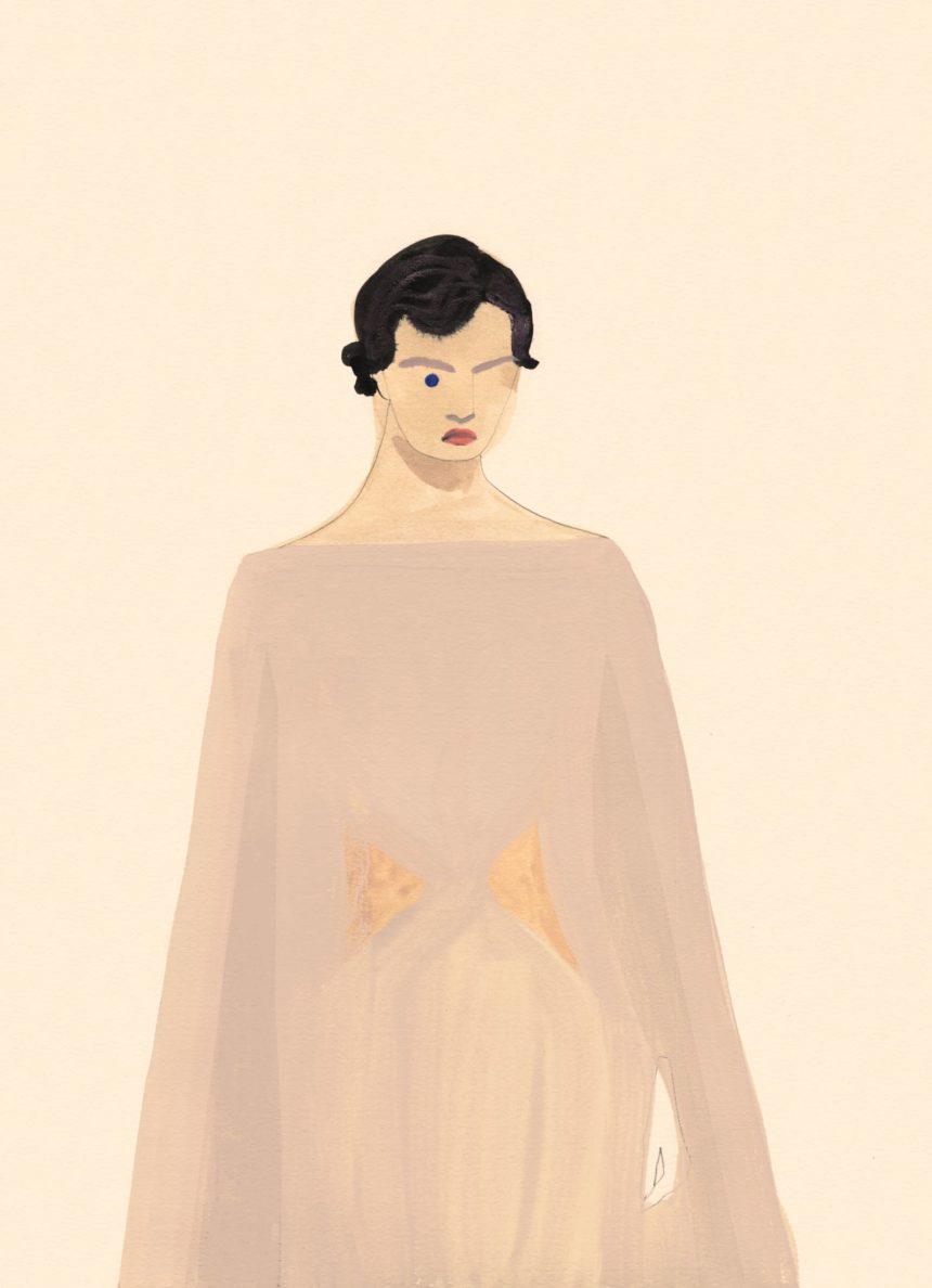 Ink illustration of Valentino couture 2018 dress by fashion illustrator Amelie Hegardt for Les Echos. Ink illustration of woman wearing Louis Vuitton glasses. Ink portrait of top model Kate Moss. Ink illustration of Heather Firbank 1910s outfit, exposed at the V&A Museum London. Illustration of woman with klein blue top and dark eye brows, for Alessia Xoccato.