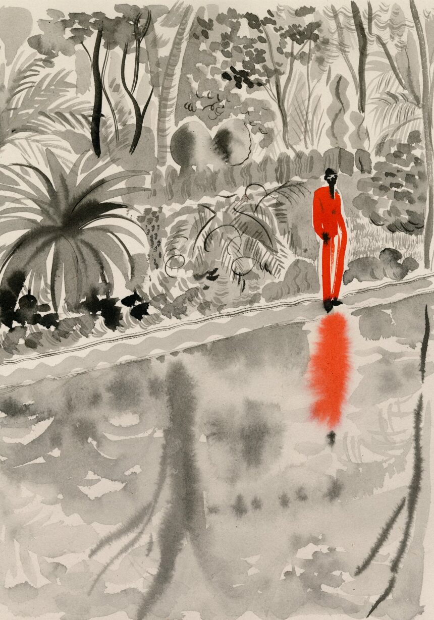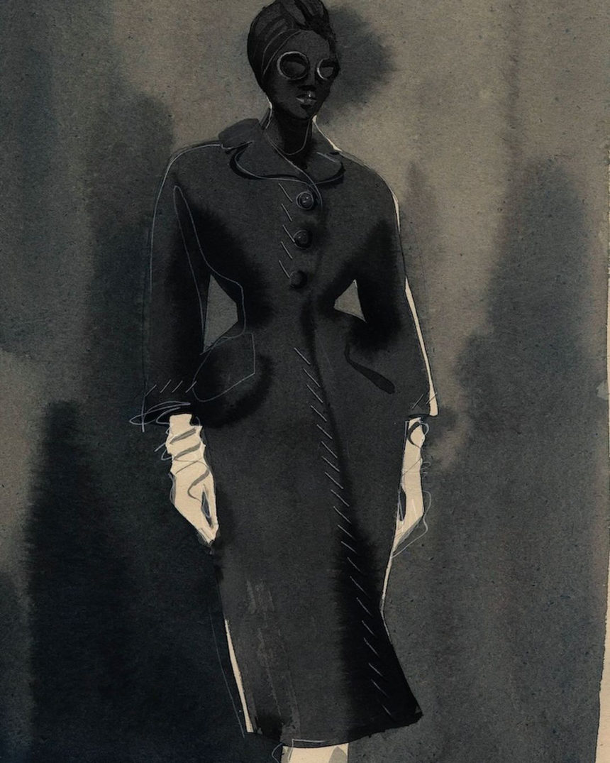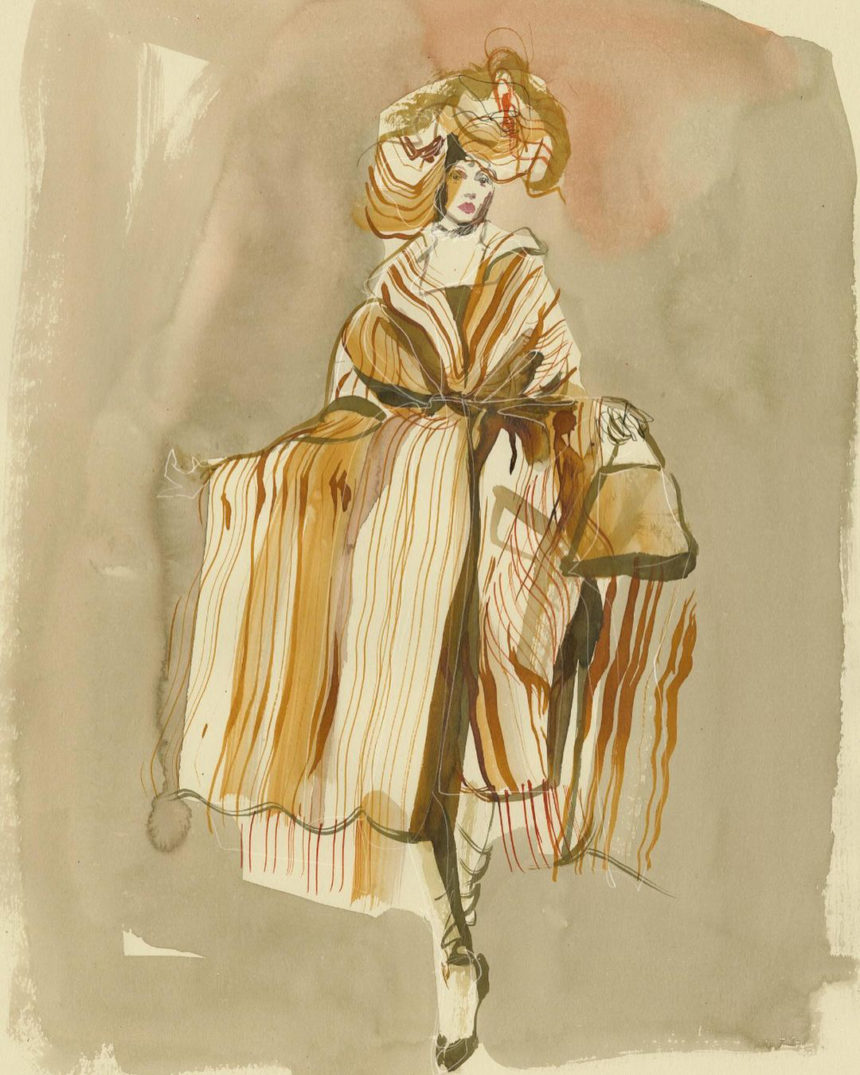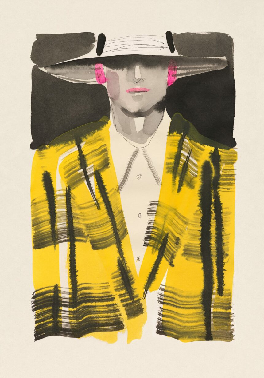 Illustration de mode, silhouette, personnage, encre, technique mixte