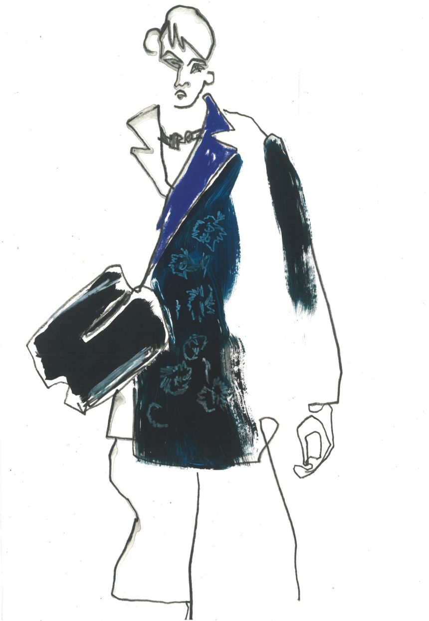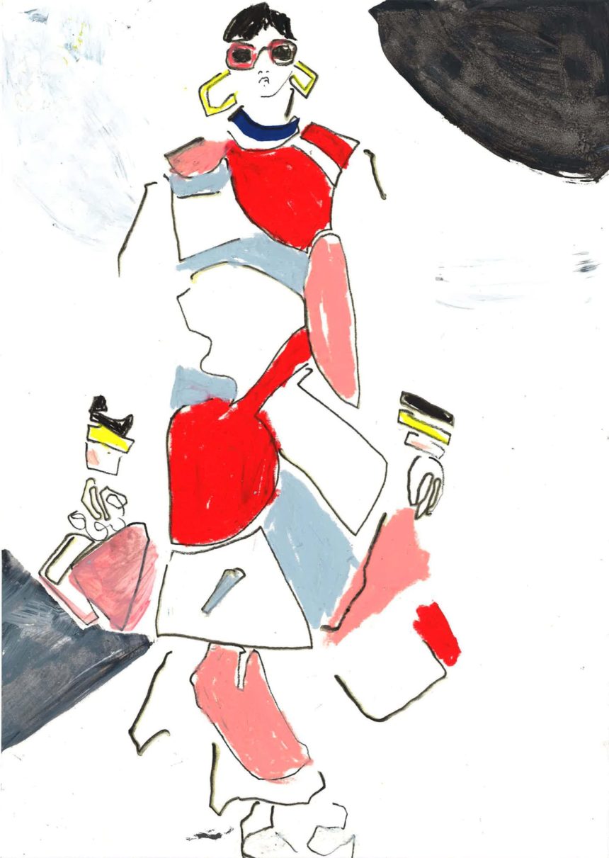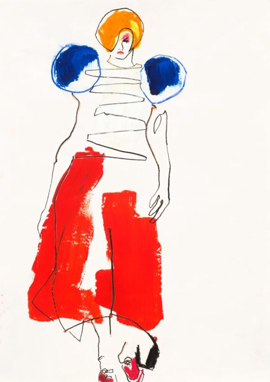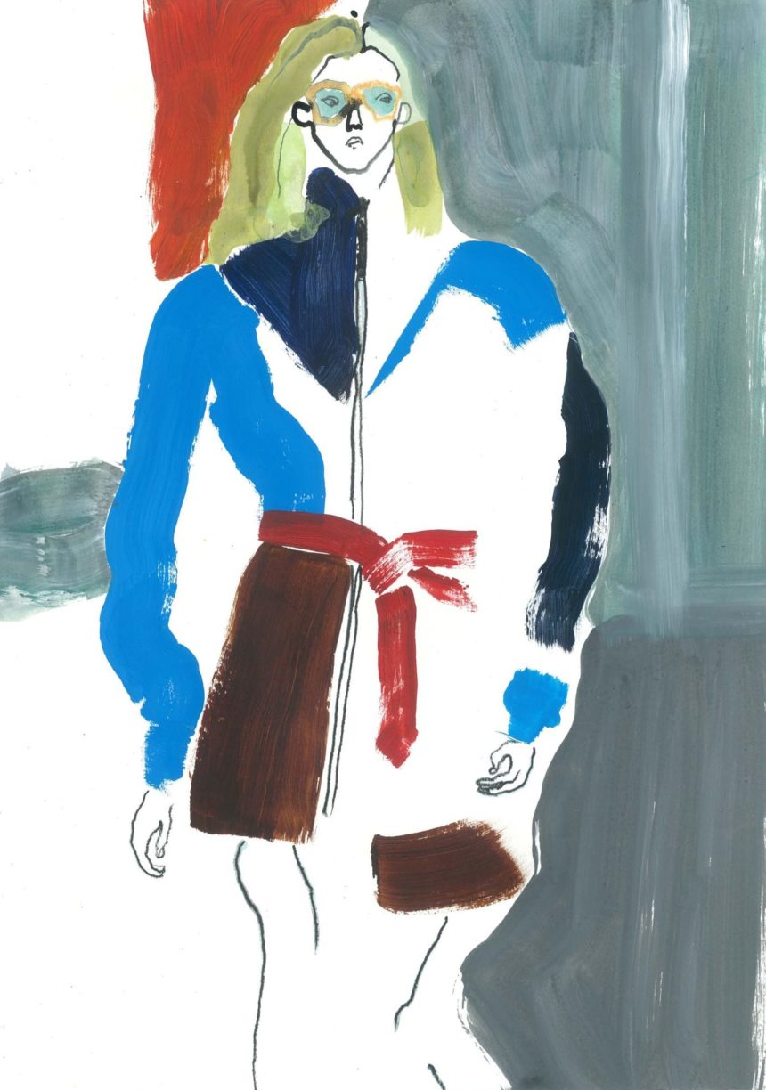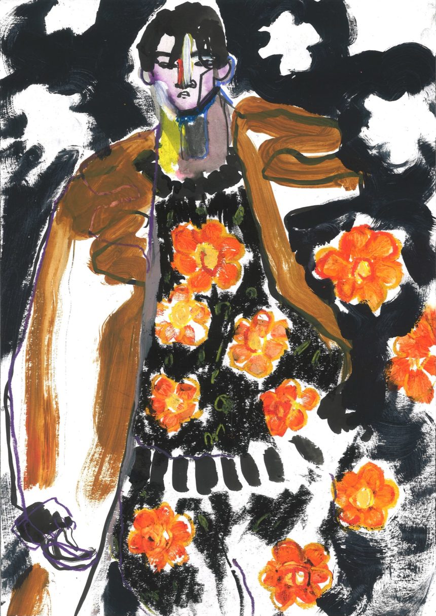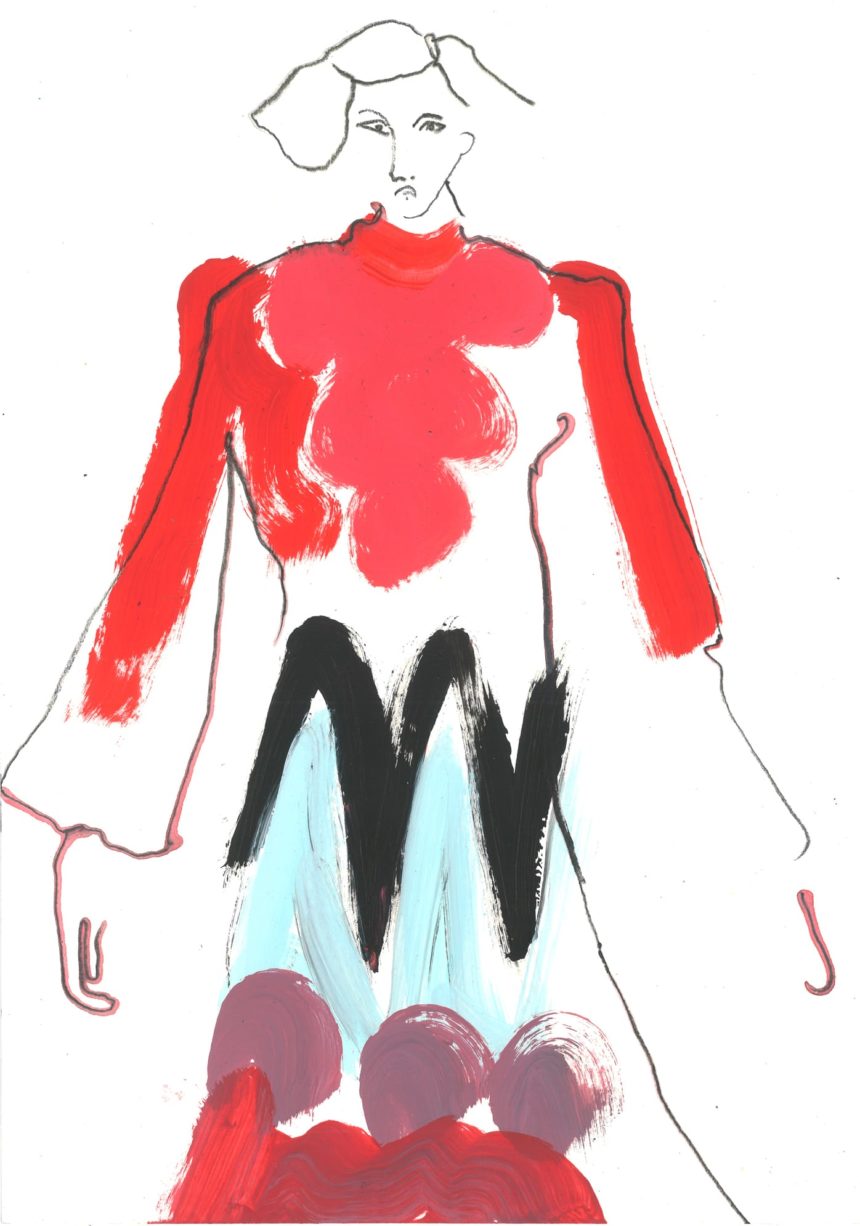 Illustration de mode, technique mixte, peinture acrylique, crayon, stylo