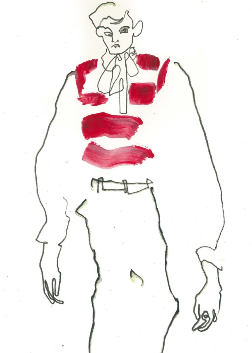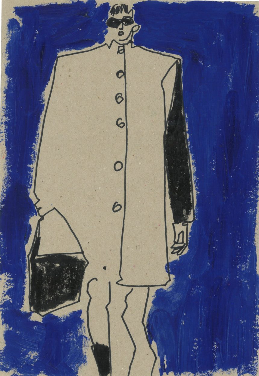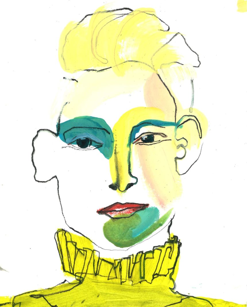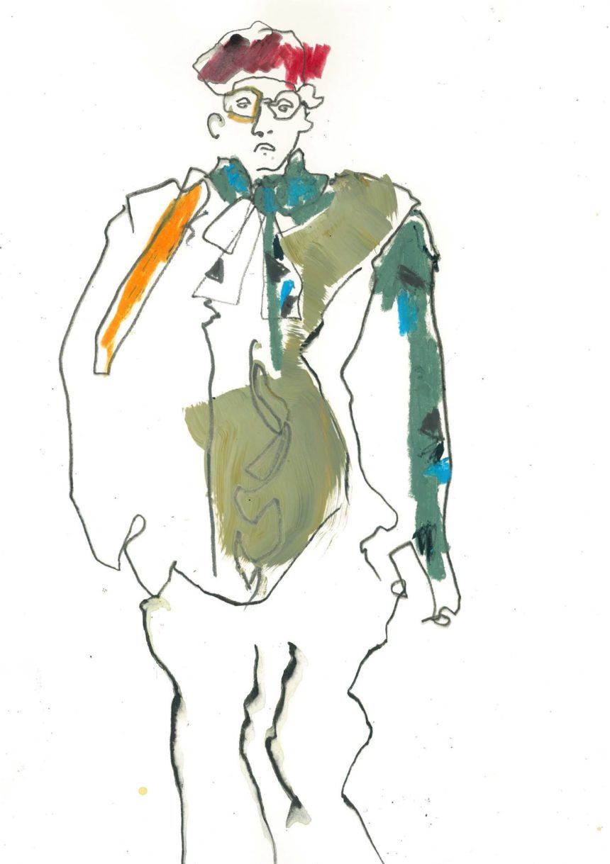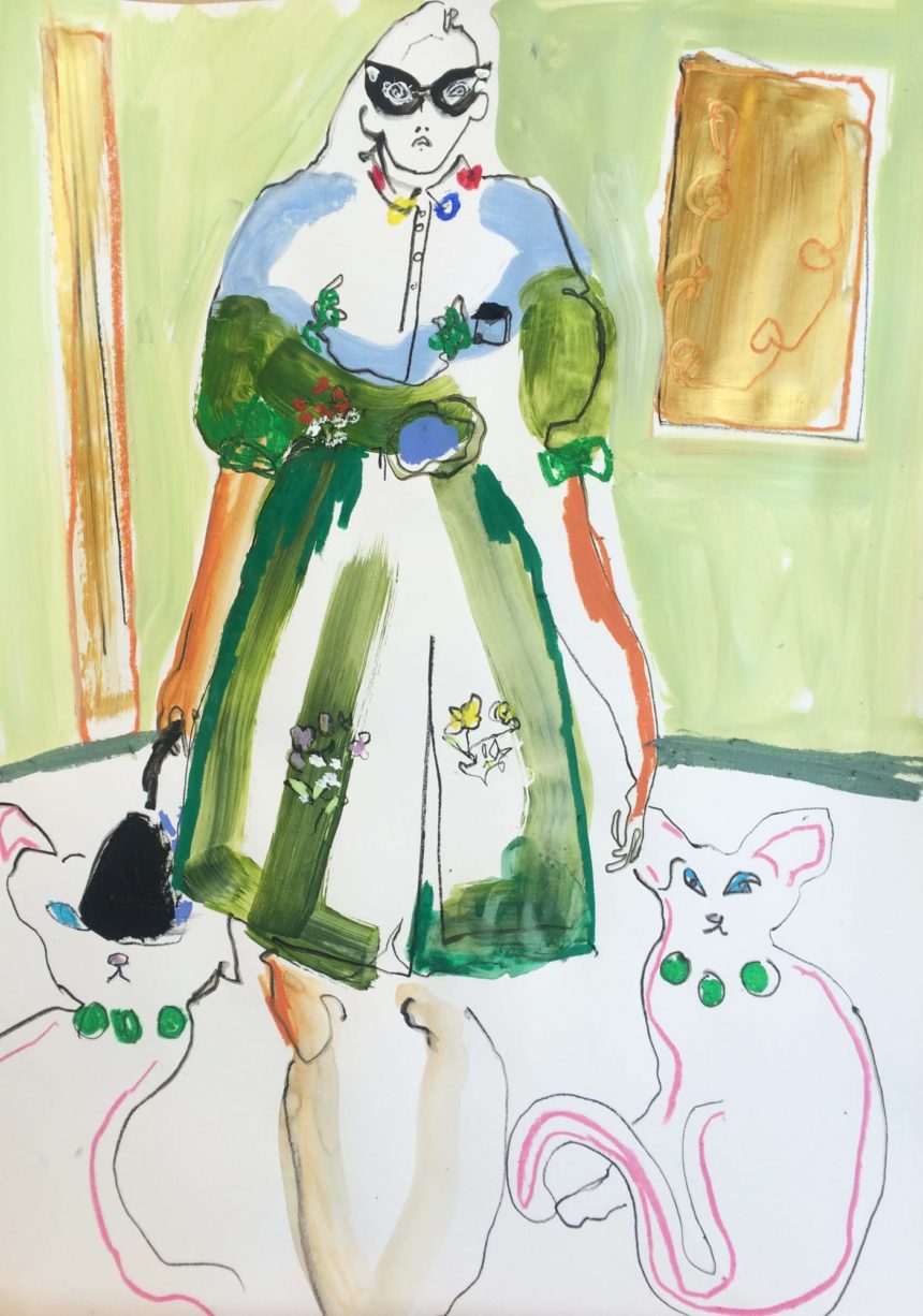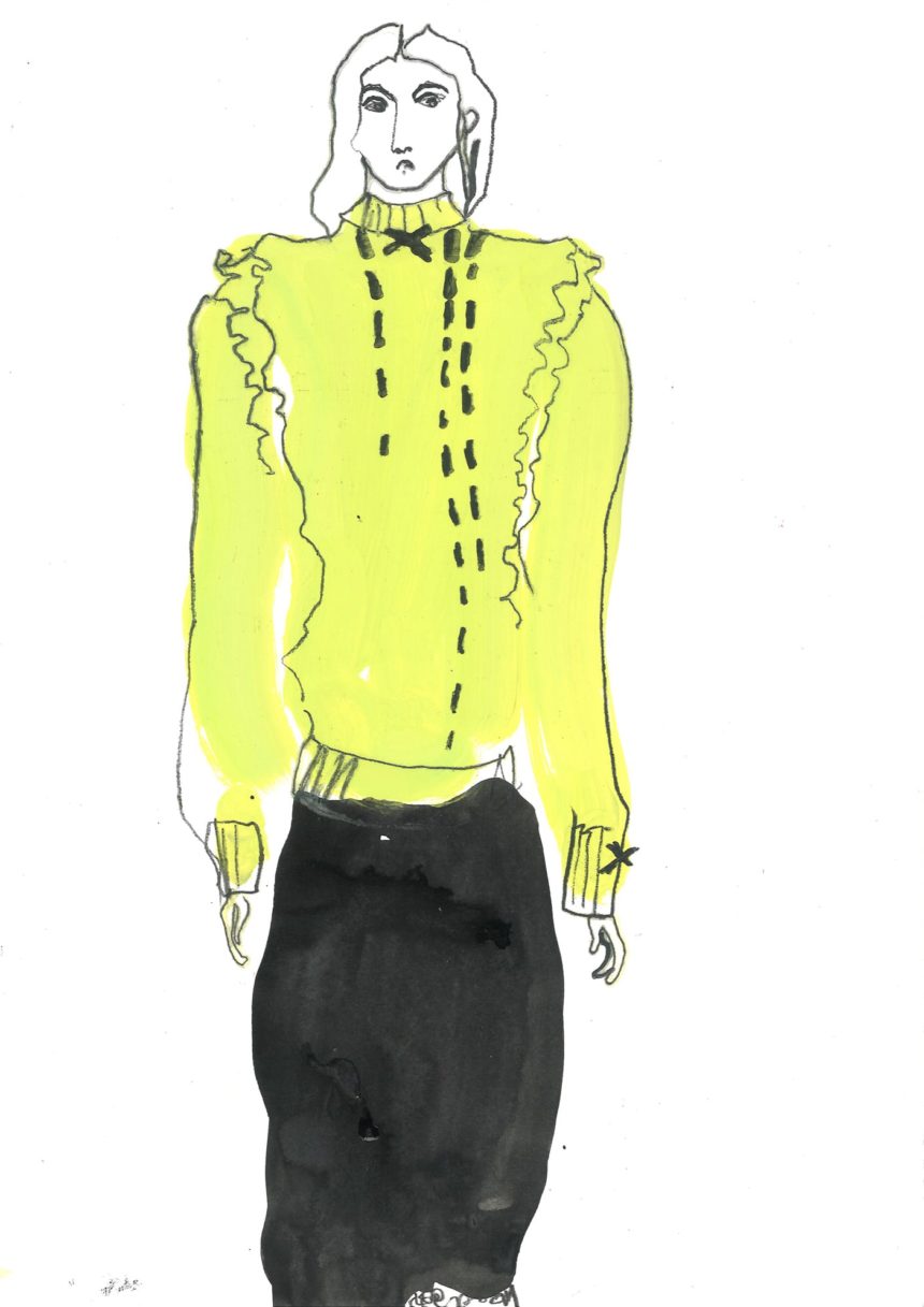 Illustration de mode, technique mixte, peinture acrylique, crayon, stylo