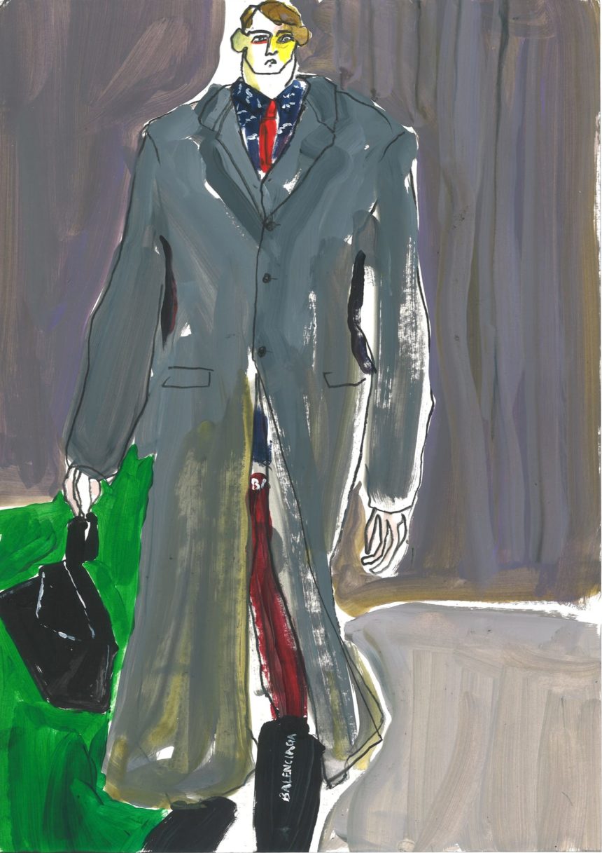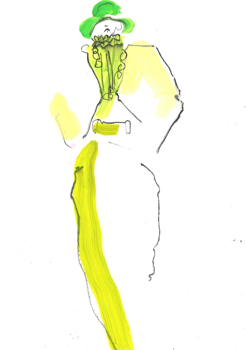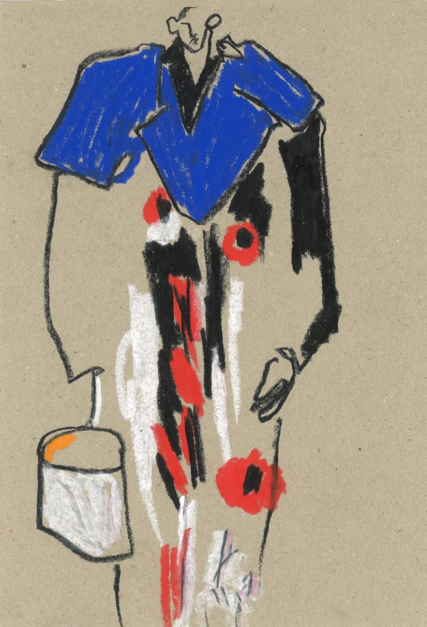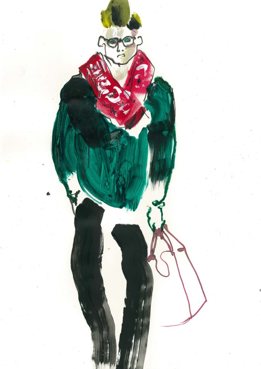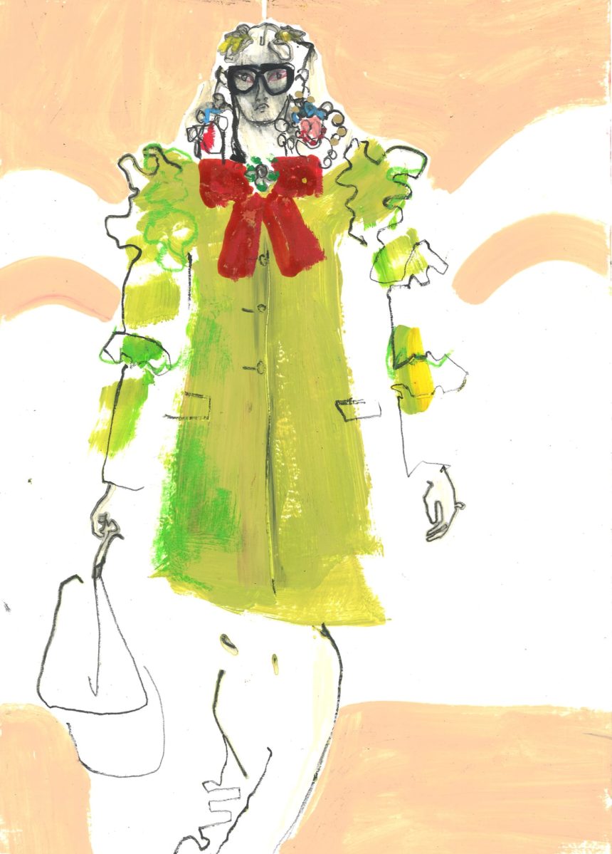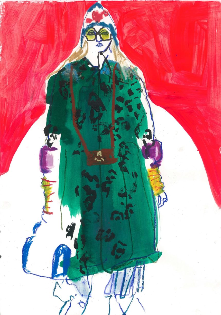 Fashion illustration, catwalk, accessories, oil pastel