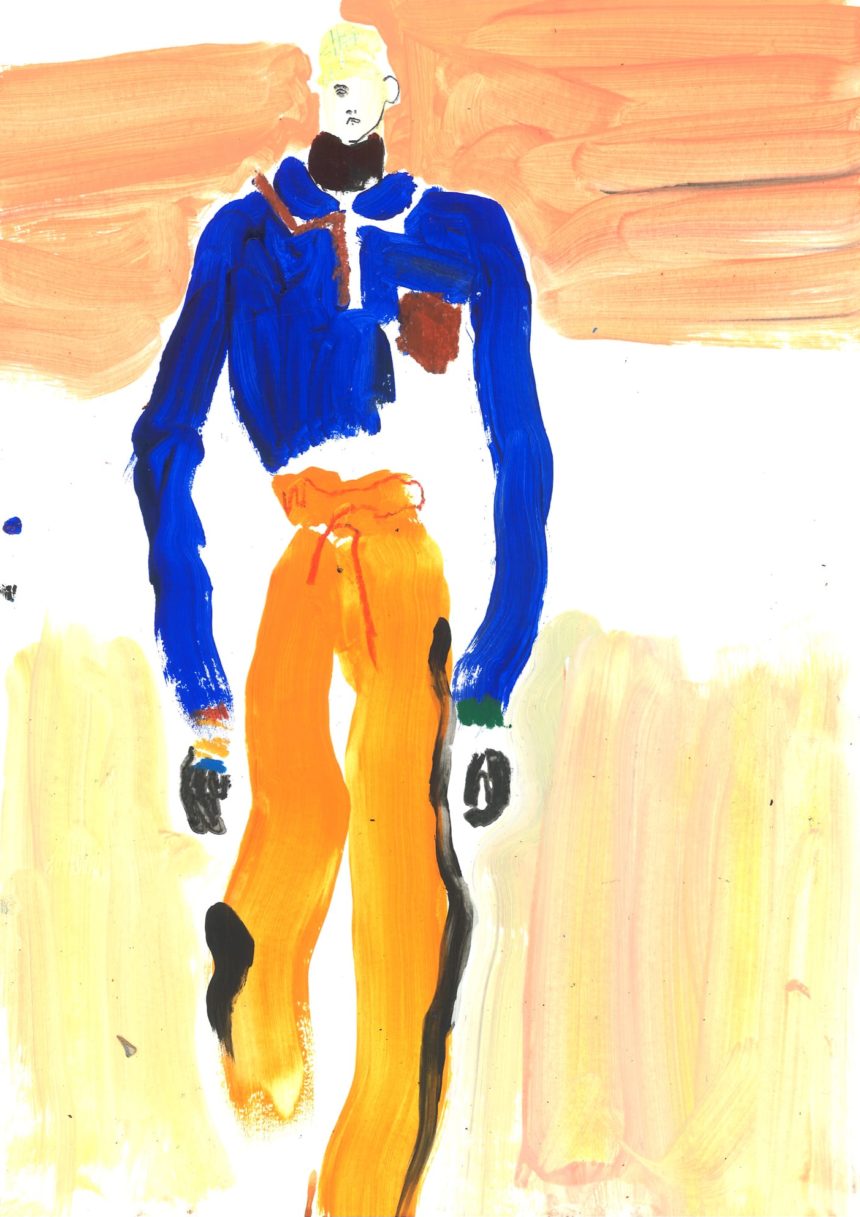 Fashion illustration, mixed media, acrylic paint, pencil, crayon
