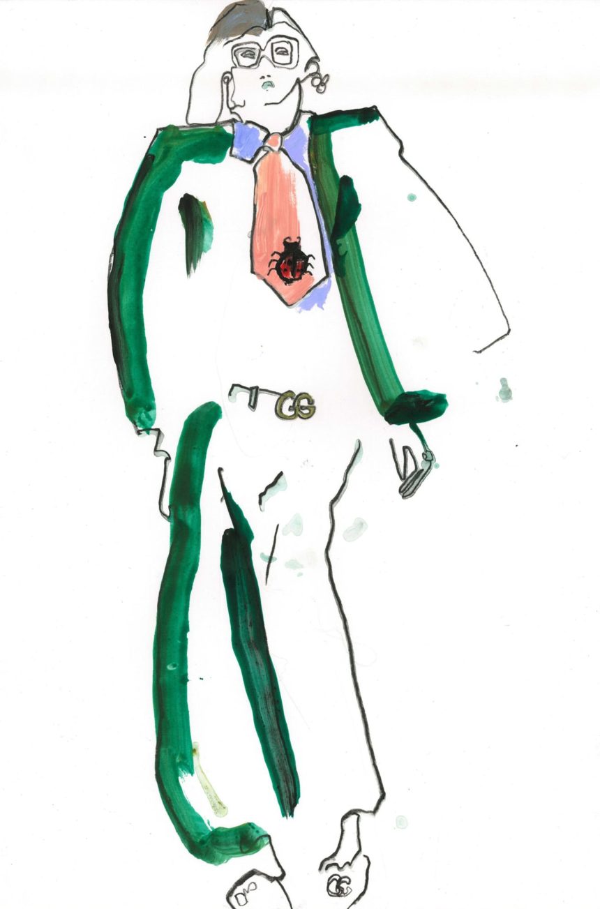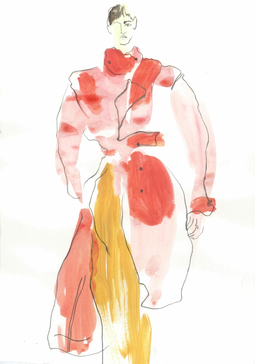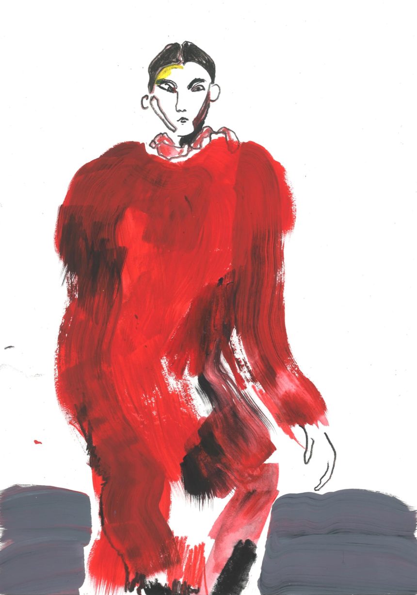 Fashion illustration, catwalk, pose, mixed media
