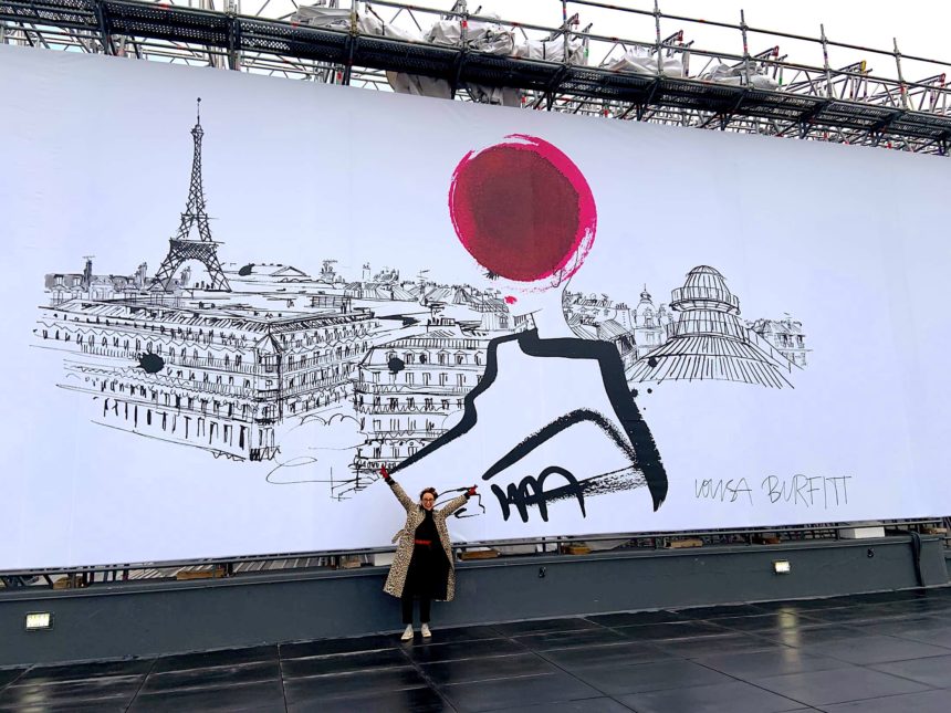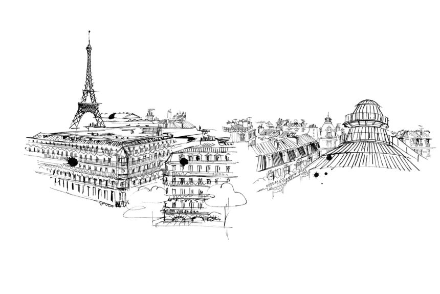 Illustration of lying silhouette in front of the Paris skyline. H&M logo with illustrations by Lovisa Burfitt Fashion illustrator Lovisa Burfitt for Hemtex, Paris Please Ink illustration fo the Bangska Palatset.