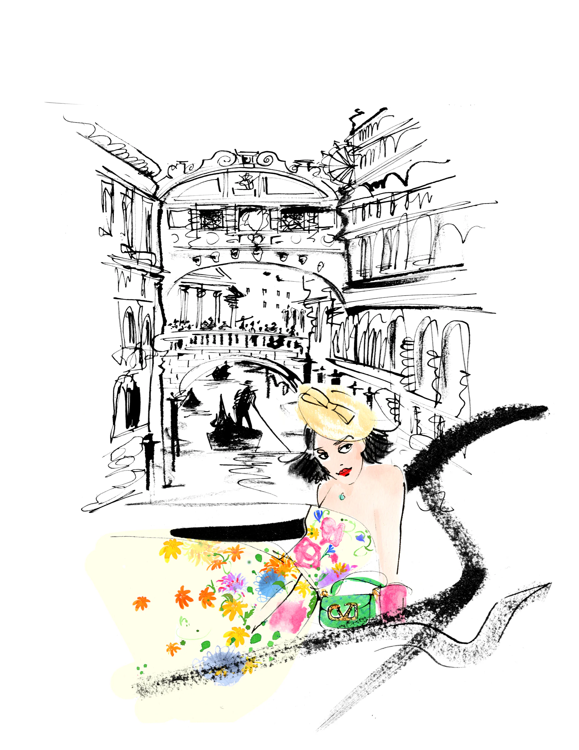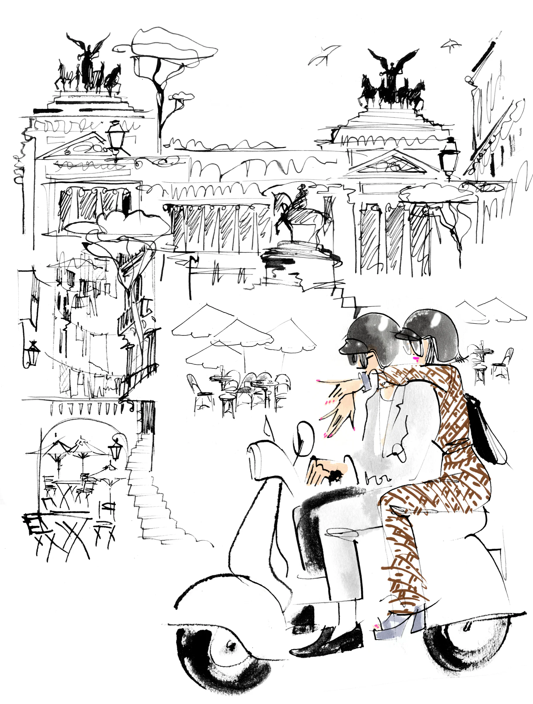Illustration of lying silhouette in front of the Paris skyline. H&M logo with illustrations by Lovisa Burfitt Fashion illustrator Lovisa Burfitt for Hemtex, Paris Please Ink illustration fo the Bangska Palatset.