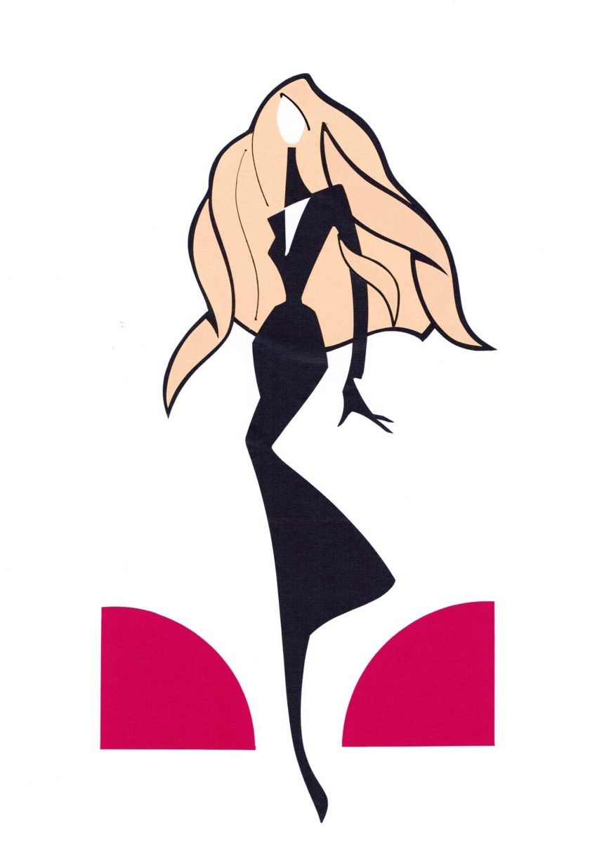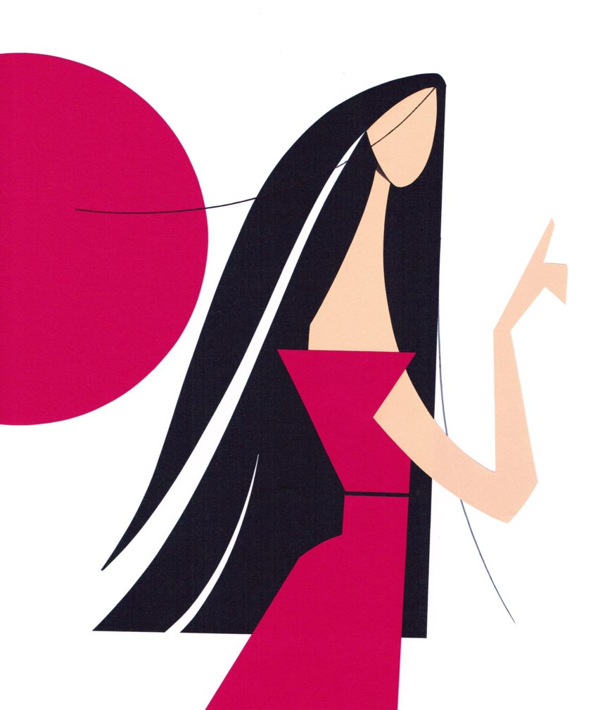 Illustration au découpage pochoir d'une femme en robe Valentino rouge et verte. Illustration graphique d'une femme en train de marcher avec la silhouette d'une chien.