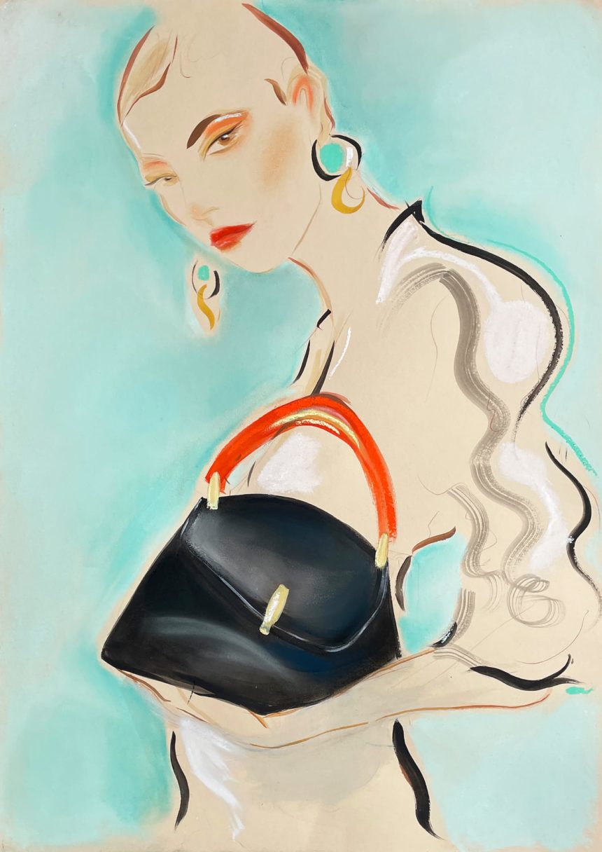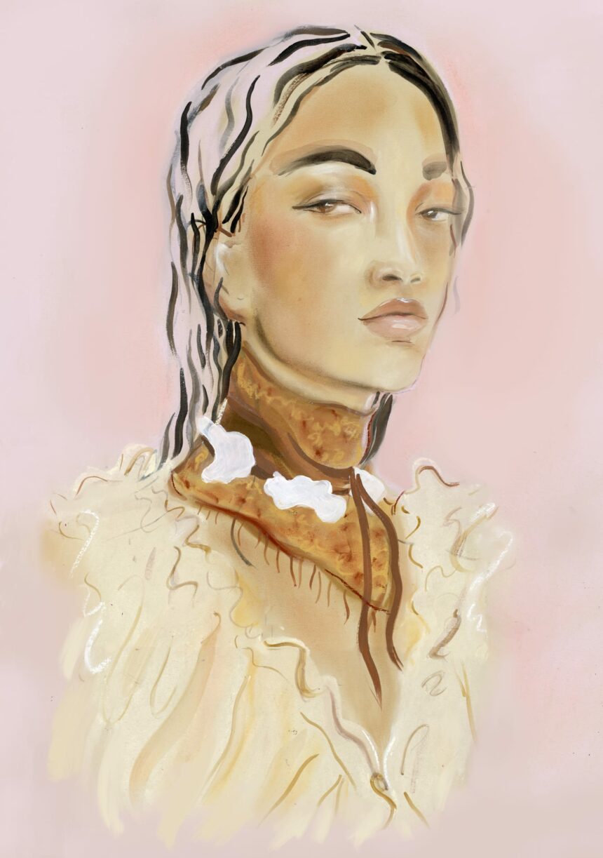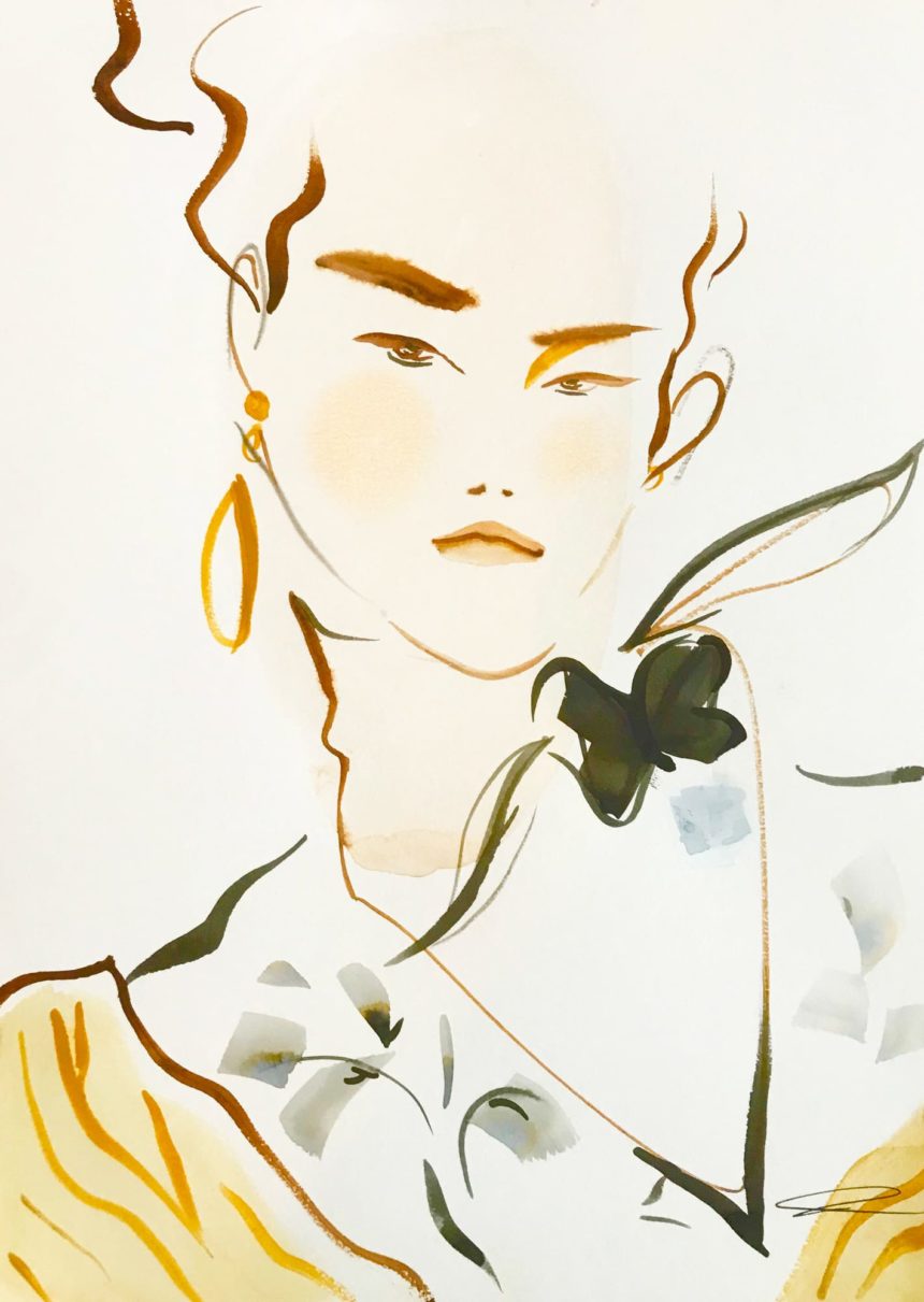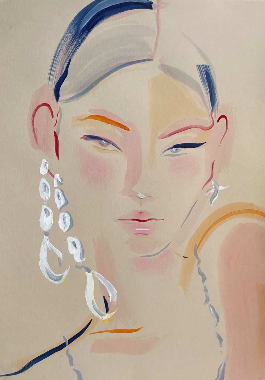 Fashion illustration, portrait, beauty, accessories, mixed media