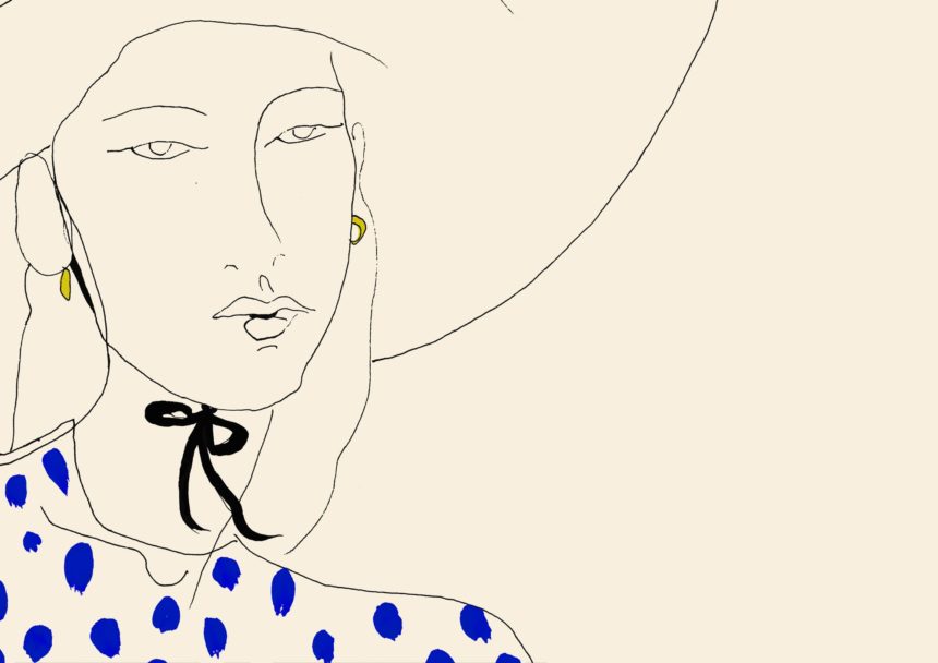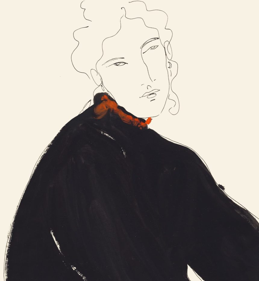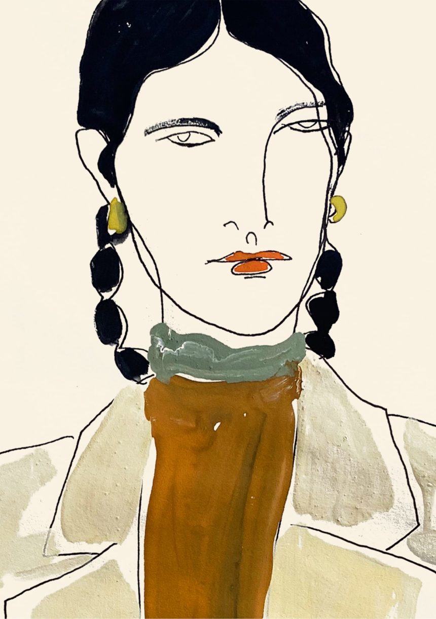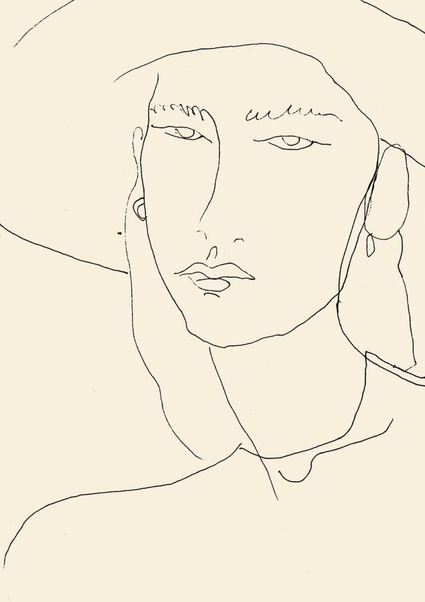 Figurative drawing, ink, accessory, portrait, fashion illustration