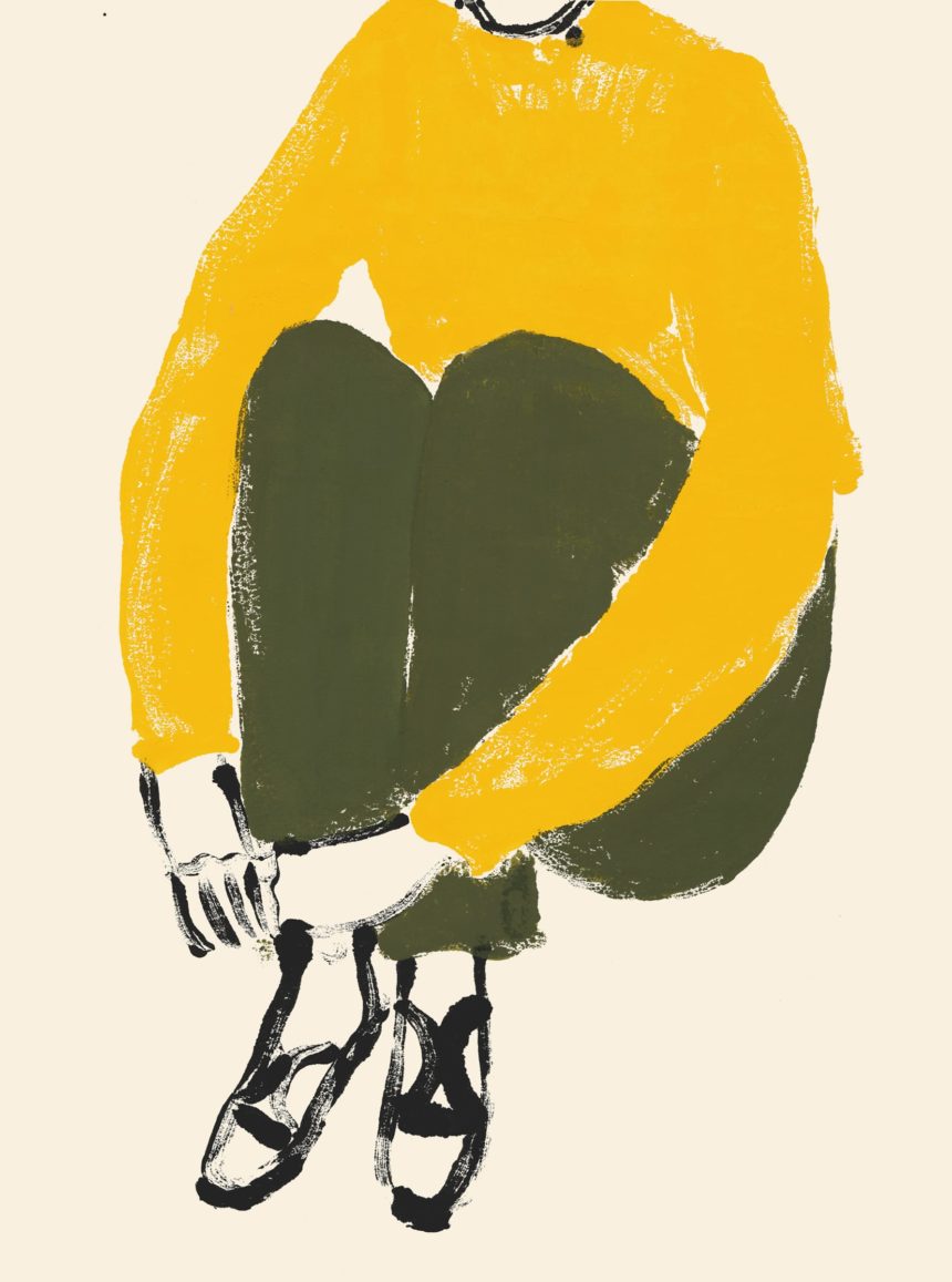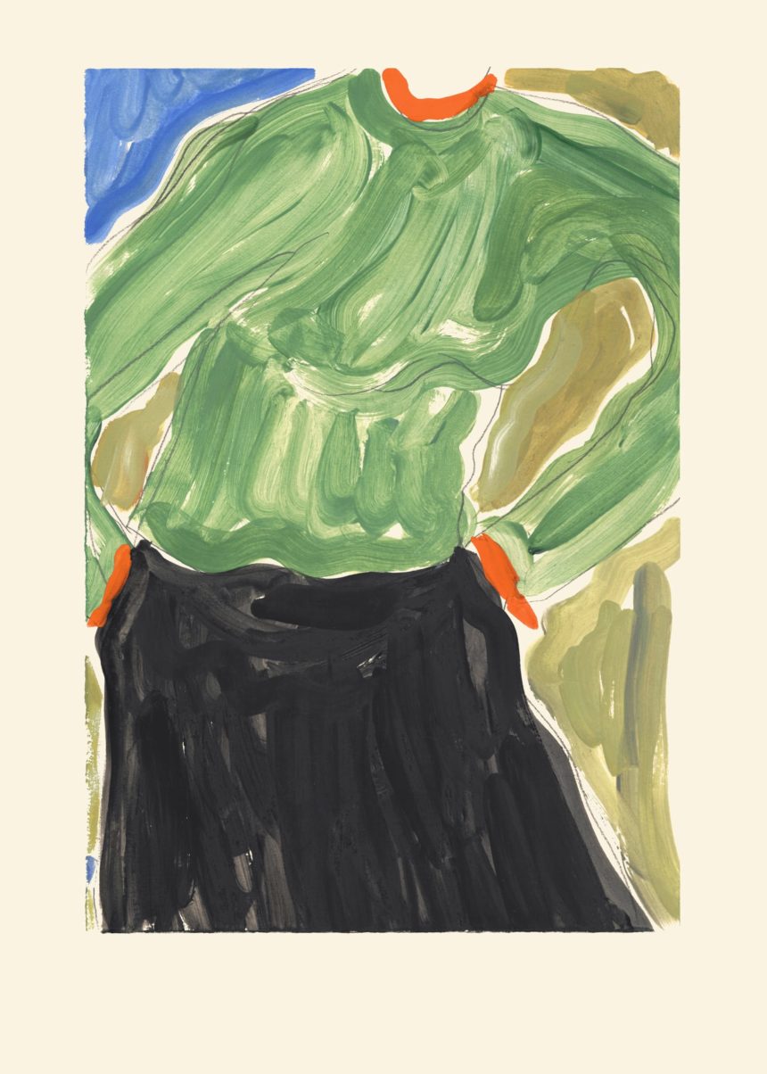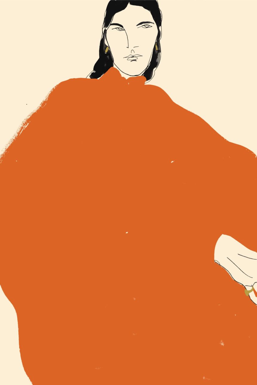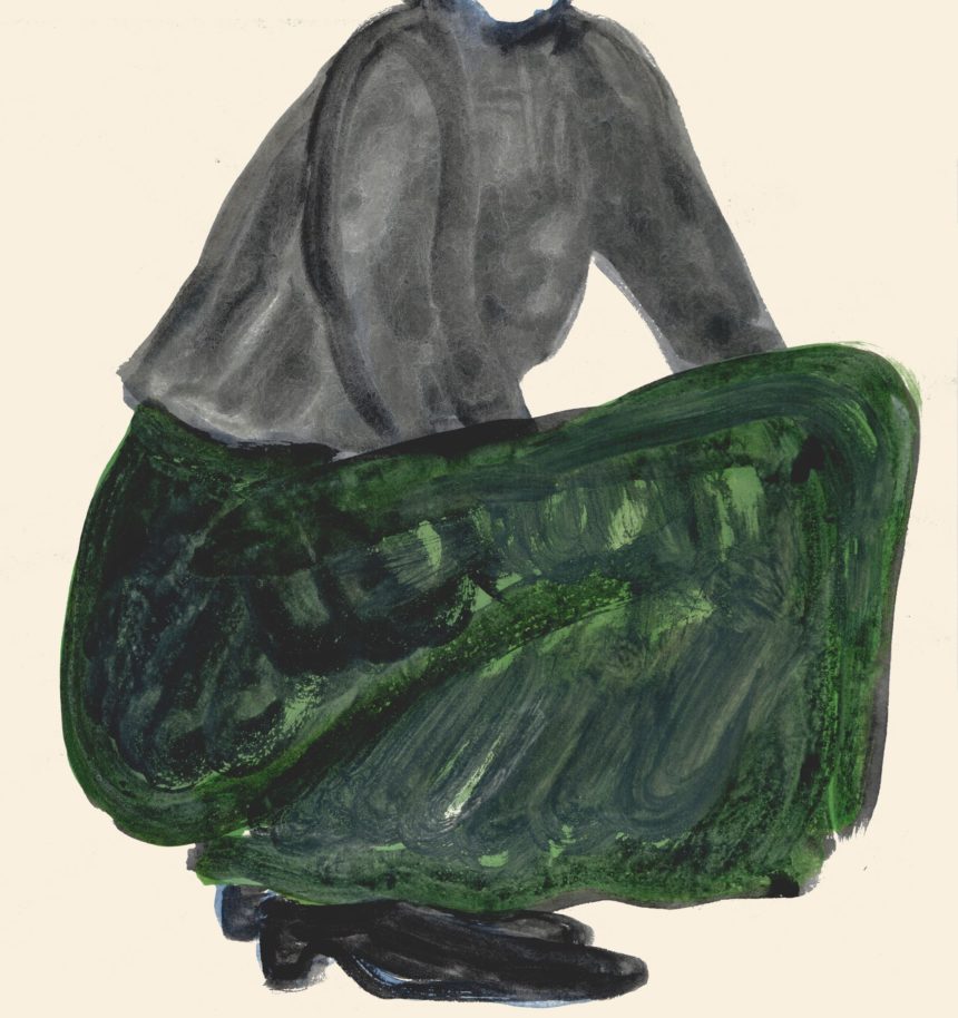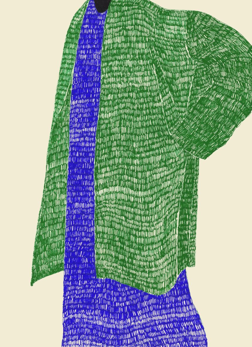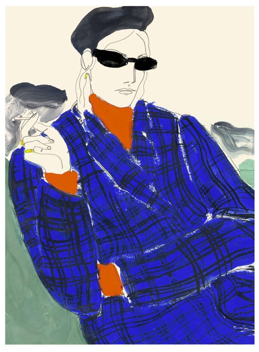 Illustration of fashion silhouette with tartan coat. Ink drawing of fashion silhouette. Illustration of woman wearing patterned dress. Illustration of women in red outfit Peinture d'une silhouette de mode avec une veste kaki.