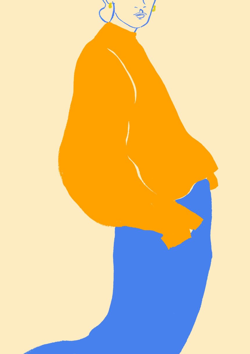 Illustration of fashion silhouette with tartan coat. Ink drawing of fashion silhouette. Illustration of woman wearing patterned dress. Illustration of women in red outfit Peinture d'une silhouette de mode avec une veste kaki.