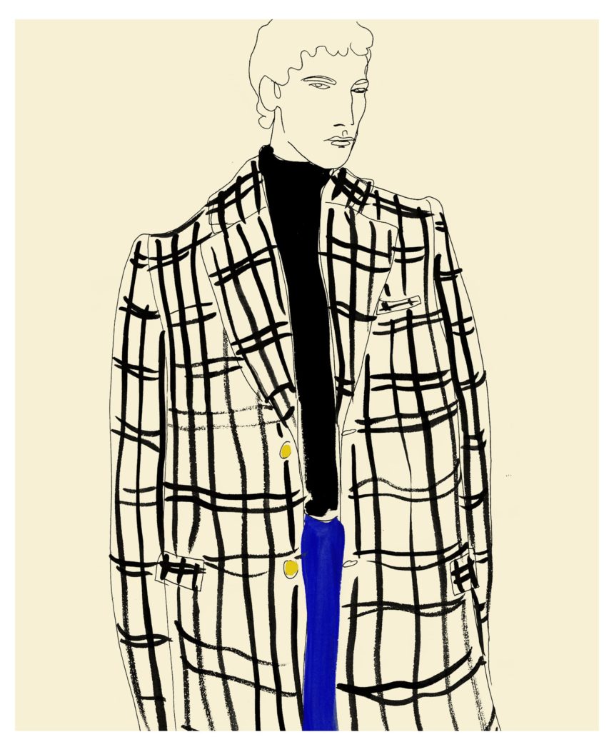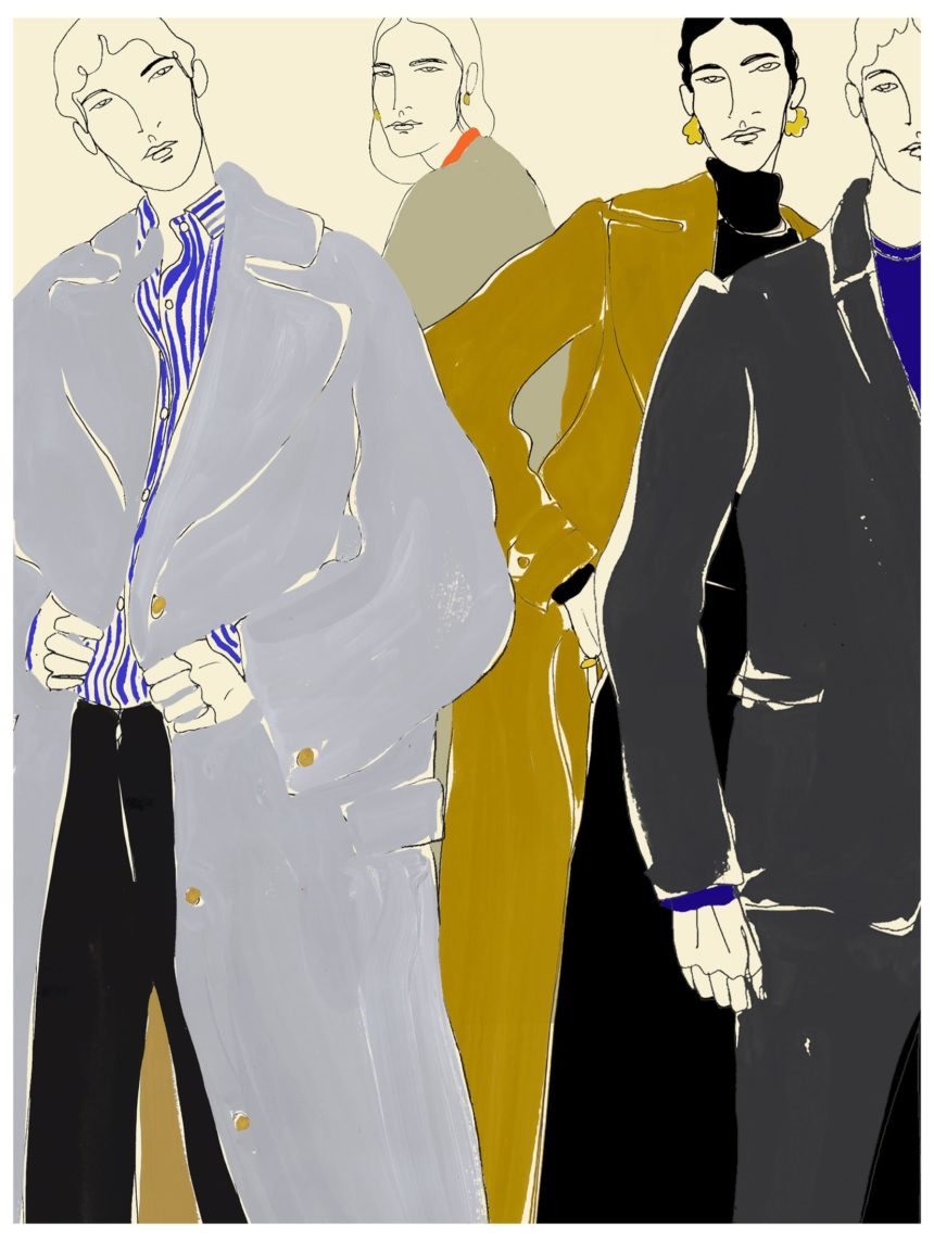 Illustration of fashion silhouette with tartan coat. Ink drawing of fashion silhouette. Illustration of woman wearing patterned dress. Illustration of women in red outfit Peinture d'une silhouette de mode avec une veste kaki.