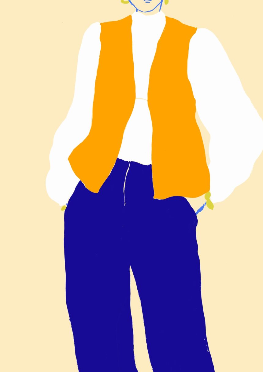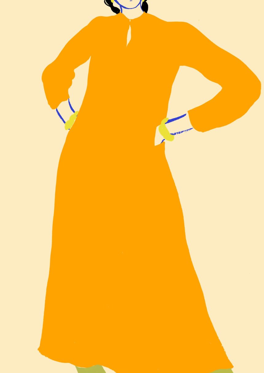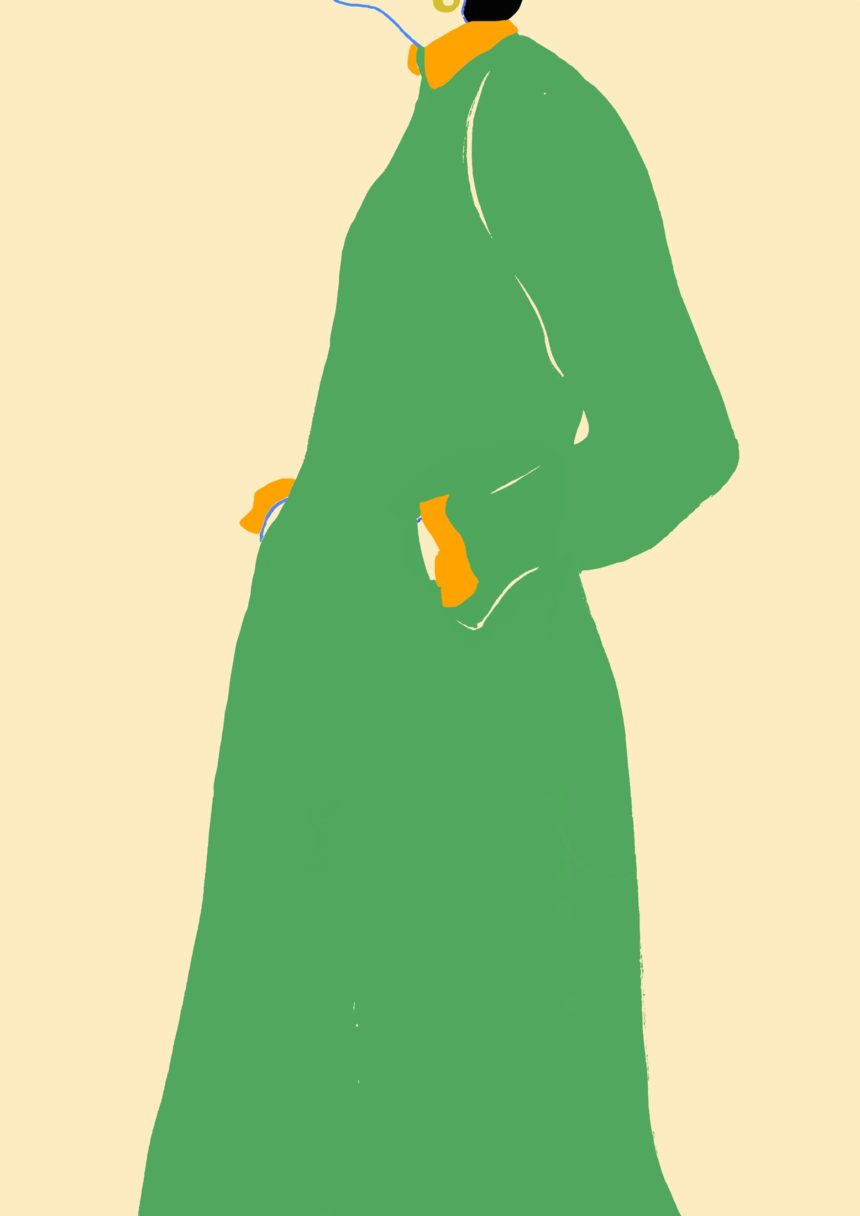 Illustration of fashion silhouette with tartan coat. Ink drawing of fashion silhouette. Illustration of woman wearing patterned dress. Illustration of women in red outfit Peinture d'une silhouette de mode avec une veste kaki.